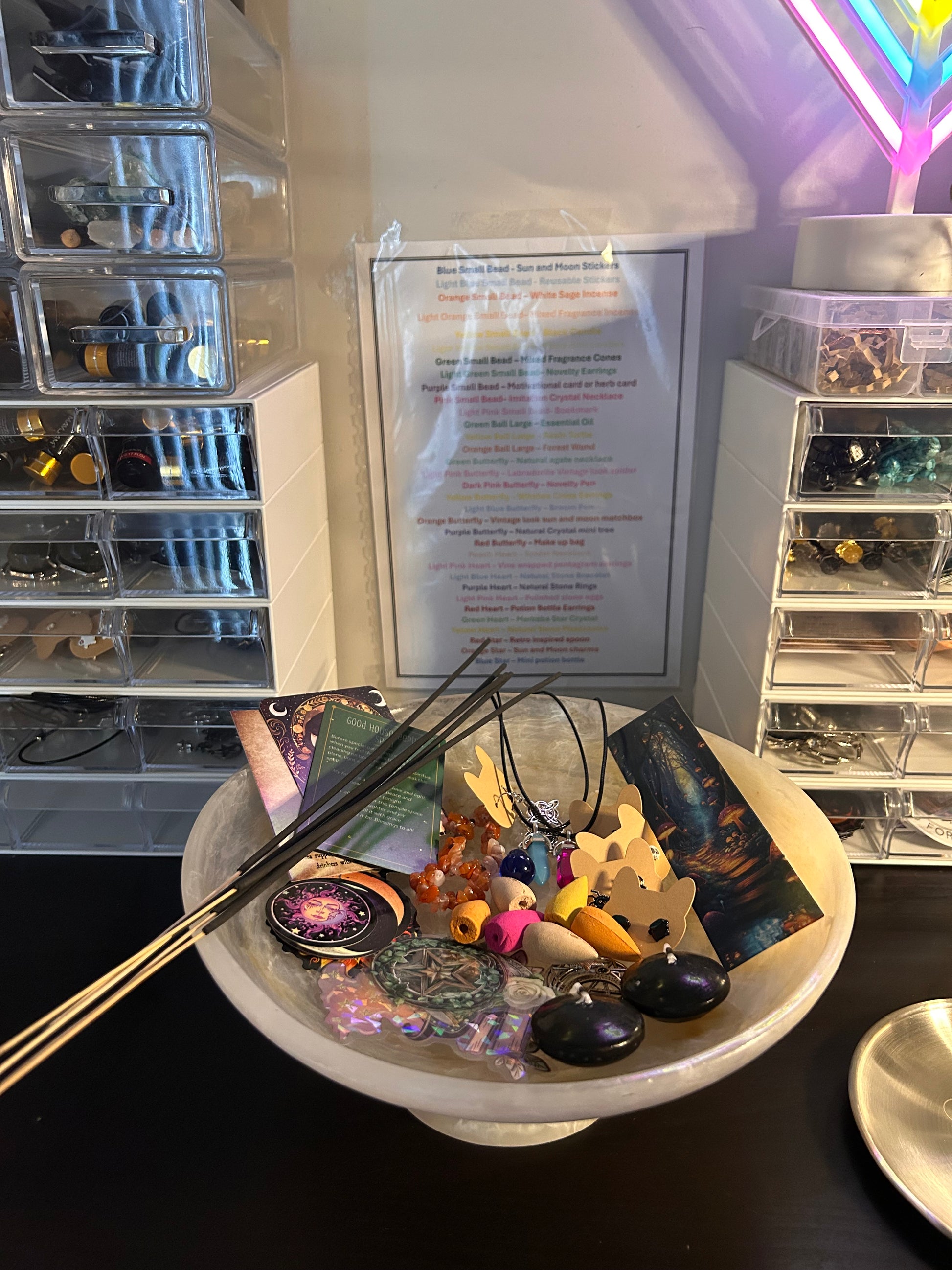 Each scoop is packed with enchanted goodies like crystals, mini self-care treats, mystical trinkets, celestial stickers, spiritual tools, and more—no two scoops are ever the same!